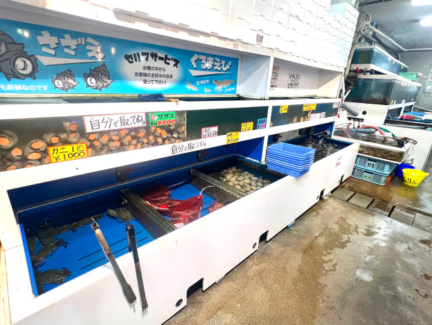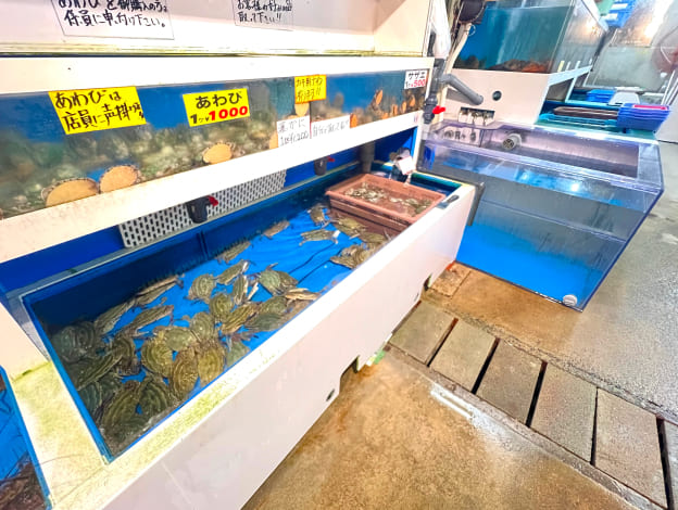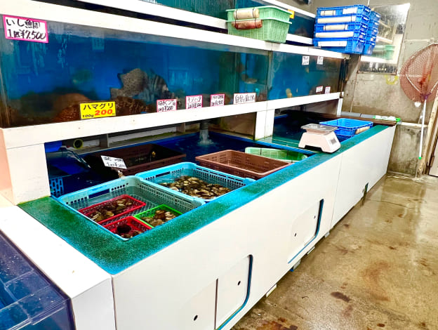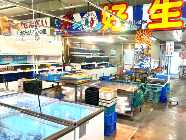 南知多町豊浜・魚ひろば「好生」では、伊勢湾・三河湾で獲れた新鮮な魚介類をはじめ、干物や海苔、佃煮など地元ならではの海産物がずらり。
